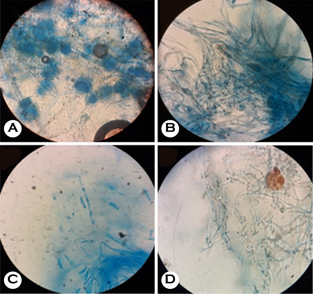 Fungal isolates were identified according to colony morph- ology on SDA, and LPCB mounts (Fig. 2) were prepared to identify filamentous fungi based on their microscopic characteristics. Based on MALDI-TOF MS, Fusarium spp. re-presented the most commonly isolated pathogens (16 isolates, 36.3%), followed by Aspergillus flavus (10 isolates, 22.7%) and Curvularia spp. (7 isolates, 15.9%). Meanwhile, Scedosporium spp. and Alternaria spp. were isolated from two patients each (4.5%), whereas Aspergillus fumigatus, Aspergillus niger, Cladosporium spp., Exserohilum turcicum, Penicillium spp., Basidiobolus spp., and Cylindrocarpon spp. were isolated from one patient each (2.2%, Table 2). The MIC is the lowest concentration of an antifungal agent that completely inhibits visible growth or leads to a significant decrease in OD relative to the control. The evaluation used amphotericin B and voriconazole as standard antifungal agents, with their results tabulated in Table 3. The results were presented as the mean ± standard deviation for quantitative variables and summarized as frequency (percentage) for categorical variables.