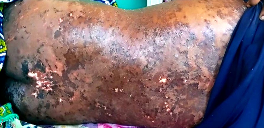 A 36-year-old male was admitted to the emergency department for diffuse abdominal pain along with burning micturition, scrotal pain, and mild discomfort while breathing for 3 days, chronic vomiting for 3 months associated with abdominal distention, and significant weight loss of approxi- mately 15 kg within 6 months. The patient was a known case of chronic liver disease for over 3 months, type II diabetes mellitus on irregular medication for the past 6 months and suspected dermatomyositis (Fig. 1) for the past 2 years. Employed as a driver, he regularly obtained and ate food from external vendors. The patient had an uneventful family history. He was a chronic alcoholic and smoker for over 10 years, and his last binge had been 6 months prior to admission. The patient had developed allergic reactions to ceftriaxone, ondansetron and pantoprazole.