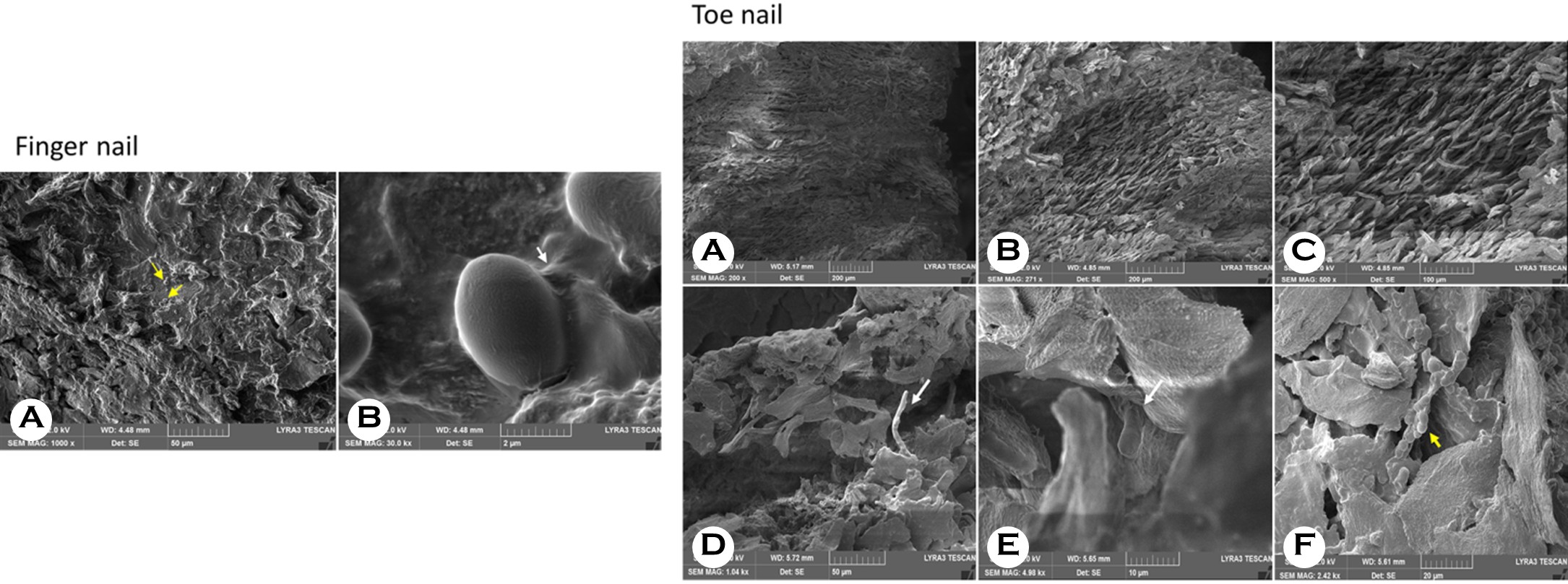 Onychomycosis treatment remains difficult, as antifungal therapies typically show low complete cure rates and high relapse rates. The pathophysiology of onychomycosis involves a complex process that includes fungal attachment, enzymatic breakdown of keratin, evasion of the host immune defenses, and gradual invasion of nail tissues, leading to significant structural and functional damage of the affected area. A nail plate affected by onychomycosis shows increased thickness but decreased tensile strength and density. Differences between healthy and infected toenails observed under a scanning electron microscope (SEM) have been documented previously. An SEM study of onychomycotic nail plates showed a ridged, tie-like ventral surface, with fungi on the underside of the toenail, evidence of penetrating the tissue corneocytes1. However, there is limited literature on the struc- tural characteristics of infected nail plates. In this study, SEM was used to observe the microscopic features of finger- and toenail plates from patients with onychomycosis, focusing on the structure of nail plates, fungal hyphae, spores, and biofilms within the infected tissues.