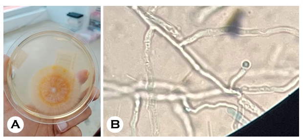 The dermatologic examination of the parietal scalp revealed alopecia with well-demarcated, gray-patch plaques measuring approximately 2 × 3 cm and 1 × 2 cm, with fine scaling and active borders. Many hairs within the plaques appeared dull and occasionally bent (bamboo-like) with broken hairs at the periphery (Fig. 1A). Wood's lamp examination in a dark room showed bright blue-green fluorescence along the infected hair shafts (Fig. 1B). The trichoscopy results showed comma hairs and corkscrew hairs on an erythematous, scaly back- ground (Fig. 2A; magnification ×20). The direct microscopy of the depilated hairs using 10% KOH revealed numerous ectothrix arthroconidia coating the hair shaft (Fig. 2B). The fungal culture of the hair fragments on SDA (incubated at a temperature of 25-28℃ for up to 4 weeks) yielded growth consistent with that of Microsporum ferrugineum, forming yellow, flat colonies with central folding and bundles of sub- merged hyphae at the periphery. The reverse showed bright yellow pigmentation (Fig. 3A). The microscopy of the culture showed long, straight hyphae with prominent cross-walls ("bamboo hyphae") and chlamydoconidia (Fig. 3B). Compared with M. audouinii, M. ferrugineum is usually more sparsely sporulating, with conidia absent or rare, and is characterized by "bamboo" hyphae and chlamydoconidia in culture. In contrast, Microsporum canis usually forms abundant large, thick-walled macroconidia with pointed ends and develops colonies with a characteristic yellow-green pigment.