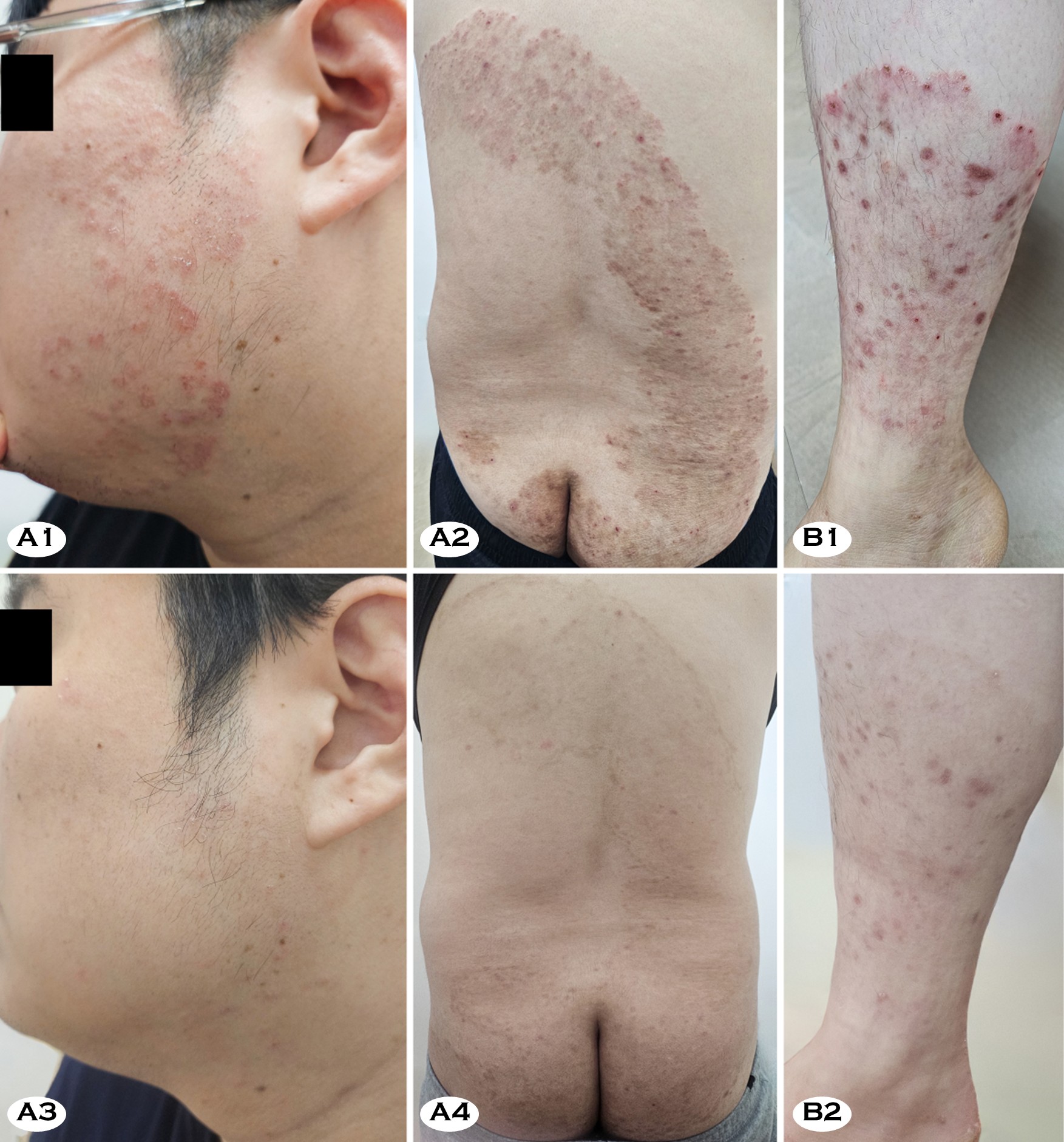 A 36-year-old man presented with multiple pruritic plaques involving the trunk, buttocks, and legs that had persisted for more than one year. The eruption began as small erythema- tous annular plaques on the thighs and gradually expanded, forming large confluent scaly plaques (Fig. 1, A1 and A2). The patient had been treated with topical terbinafine preparation and oral terbinafine (200-375 mg/day) for three months with- out improvement. In fact, the lesions became more extensive. Subsequently, he received oral itraconazole (200 mg/day) irregularly for about five months. However, this regimen only led to brief periods of partial improvement. For severe itching, he intermittently received short courses of oral methylpredni- solone and used topical antifungal-corticosteroid combination creams (clotrimazole-hydrocortisone, econazole-triamcinolone acetonide, and isoconazole nitrate-diflucortolone valerate), but the eruption progressively worsened. The patient had no history of overseas travel.
