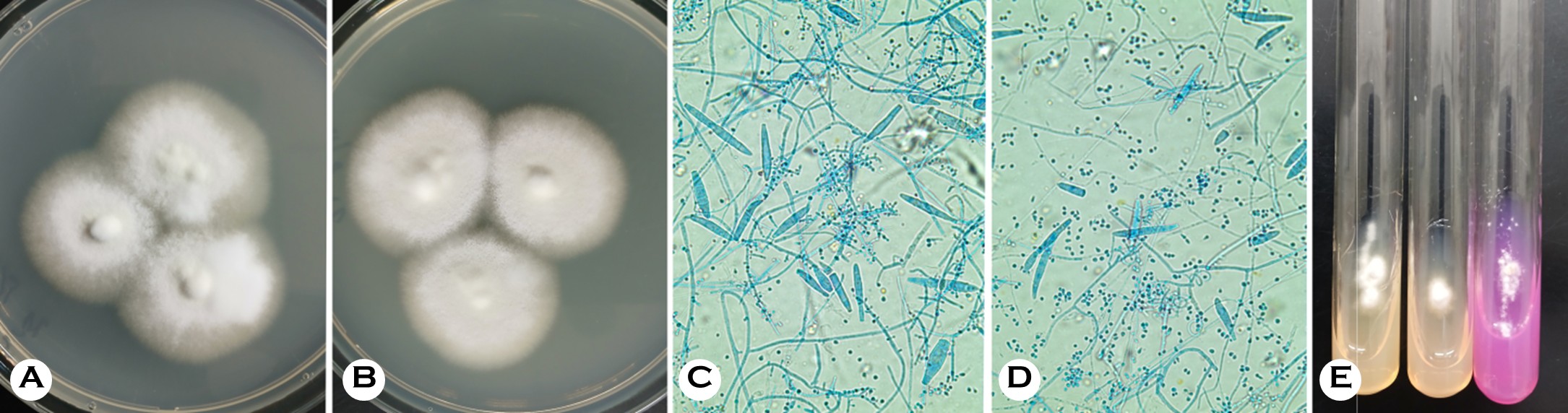 Microscopic examination revealed numerous pyriform microconidia arranged in grape-like clusters, spiral hyphae, and frequent macroconidia, which are features compatible with the TMTI complex (Fig. 2, C and D). Urease test on Christensen's urea agar remained negative after 14 days, whereas T. mentagrophytes and T. interdigitale controls typic- ally became positive within one week (Fig. 2, E). The negative urease reaction supported T. indotineae as the presumptive species.