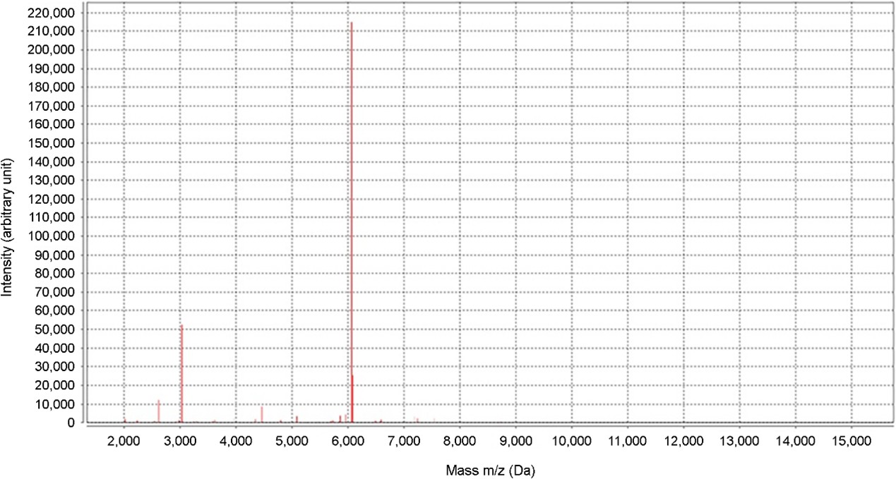 The physical examination results revealed erythematous exudative patches with thick, adherent, yellowish-brown crusts on the face and left upper arm (Fig. 1 A, B). Notably, the lesions on the left arm showed a linear arrangement, suggesting autoinoculation via scratching (Fig. 1 C). A micro- biological examination was performed using a swab from an exudative lesion on the left arm. The sample was inocu- lated onto a 5% sheep blood agar plate. Initial incubation at a temperature of 30℃ with 5% CO2 for 24 hours yielded insignificant growth. However, subsequent incubation at a temperature of 37℃ with 2.5% CO2 for an additional 48 hours resulted in the profuse growth of colonies. The colonies showed several characteristic features, including a rough and wrinkled appearance, dry consistency, adherence to the agar substrate, and golden-yellow pigmentation with β-hemolysis (Fig. 2). The Gram staining results revealed Gram- positive organisms with significant pleomorphism. While a few branching filaments were observed, the smear was pre- dominantly composed of fragmented short filaments and coccoid cells arranged in distinctive cuboid packets (Fig. 3). For definitive identification, matrix-assisted laser desorption/ ionization time-of-flight mass spectrometry (MALDI-TOF MS) was performed using the VITEK MS system (bioMérieux, Marcy-l'Étoile, France) equipped with the IVD Database v3.2. The analysis identified the isolate as Dermatophilus congolensis with a 99.9% confidence level, suggesting a high-confidence identification (Fig. 4). Based on the clinical findings and microbiological confirmation, a diagnosis of cutaneous der- matophilosis was made. The patient was treated with 50 mg oral doxycycline twice daily for 2 weeks. At the 1-week follow-up visit, the exudative crusts and infiltrated plaques were almost completely resolved, indicating a dramatic response to the treatment. However, only residual indistinct erythema and post-inflammatory hyperpigmentation were observed (Fig. 1 D, E). No recurrence was observed during the 2-month follow-up period.