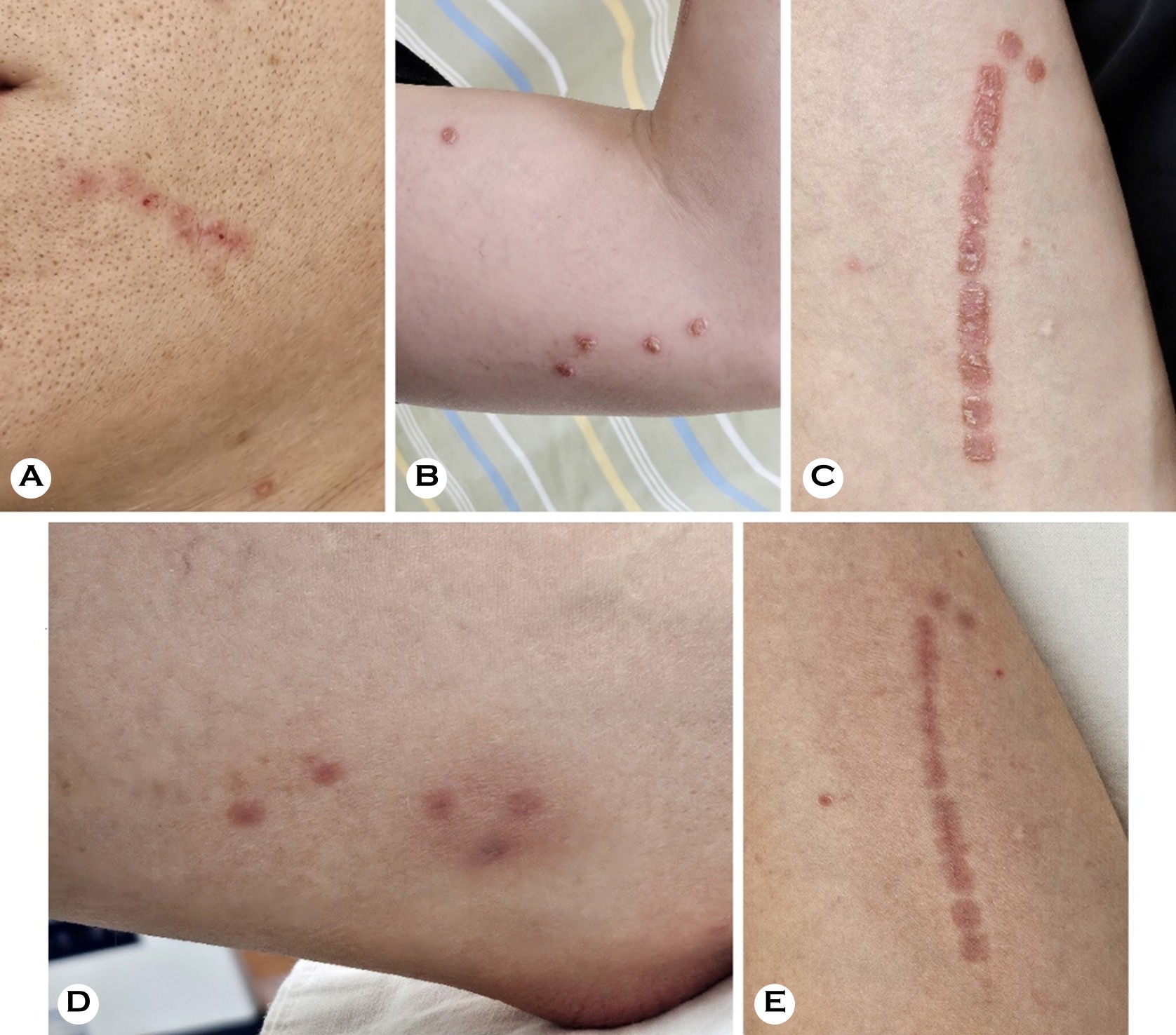 This study investigated a 30-year-old healthy man who pre- sented with multiple pruritic, erythematous patches covered with thick yellowish crusts on his face and left arm. The lesions had been present for 1 month. The patient reported a history of a minor scratch on his left arm preceding the eruption. The lesions initially appeared at the site of trauma and subse- quently disseminated to his face. Despite 2 weeks of empirical treatment at a local clinic with oral antihistamines, antibiotics, topical antibiotics (mupirocin), and corticosteroids (predni- carbate and diflucortolone valerate), the lesions showed no improvement and continued to spread. Systemic symptoms, including fever and chills, were not observed. The patient was an office worker living in an urban area and denied recent travel or contact with livestock. He reported occasional con- tact with healthy dogs but showed no evidence of cutaneous infection.