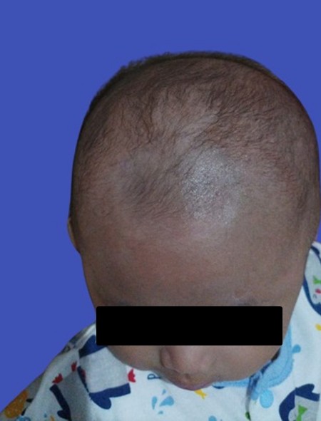 This study investigated a 2-month-old Javanese girl who was referred to the Dermatology and Venereology outpatient clinic of Dr. Soetomo General Academic Hospital, Surabaya, with hair loss since birth, followed by progressive scalp redness over the preceding 4 weeks. Two weeks after birth, a hair clump with yellowish discharge was observed, which grad- ually enlarged and was followed by patchy hair loss and surrounding erythematous plaques. Pruritus and pain were not assessable. No history of preceding fever was noted. The patient's mother denied similar complaints among household contacts and any known fungal infections. The family had no pets, although many stray cats roamed around the house. Before referral, a pediatrician considered milk allergy and advised switching formula; however, no improvement was noted. A subsequent physician prescribed topical miconazole for 1 week, indicating no clinical response.