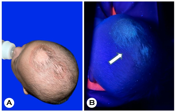 Although TC remains uncommon, recent literature suggests that it is increasingly recognized, with underreporting likely due to diagnostic delay and clinical overlap in early infancy. This suggests the value of layered diagnostics (Wood's lamp examination, trichoscopy, KOH, and fungal culture) in very young infants. Clinically, TC may range from subtle alopecia to well-demarcated, erythematous, scaly, nonscarring patches with broken hairs, often involving the occiput5. Our patient presented with symptoms of alopecia with annular erythema- tous plaques and active borders—features that are typical of TC. More specifically for Microsporum ferrugineum, classic des criptions emphasize a gray-patch pattern with dull, occa- sionally bent ("bamboo-like") hairs and broken hairs. Consist- ent with these characteristics, in the present case, several hairs within the plaques appeared dull and bent with peripheral broken hairs. Moreover, bright blue-green fluorescence based on Wood's lamp examination supported the Microsporum etiology. Wood's lamp fluorescence in Microsporum infection may vary in intensity depending on the stage of infection, previous topical treatments, environmental lighting, and device quality. Thus, faint fluorescence does not exclude M. ferrugineum, especially when supported by culture confirm- ation.