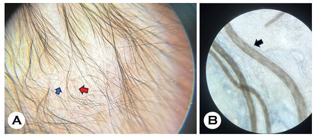 The diagnosis of TC is supported by Wood's lamp exam- ination and trichoscopy/dermoscopy and confirmed by direct microscopy using potassium hydroxide (KOH) preparations of scalp scrapings and affected hairs, with subsequent fungal culture from the same specimens. The characteristic tricho- scopic patterns can also expedite a correct diagnosis1.
