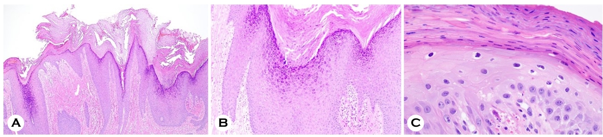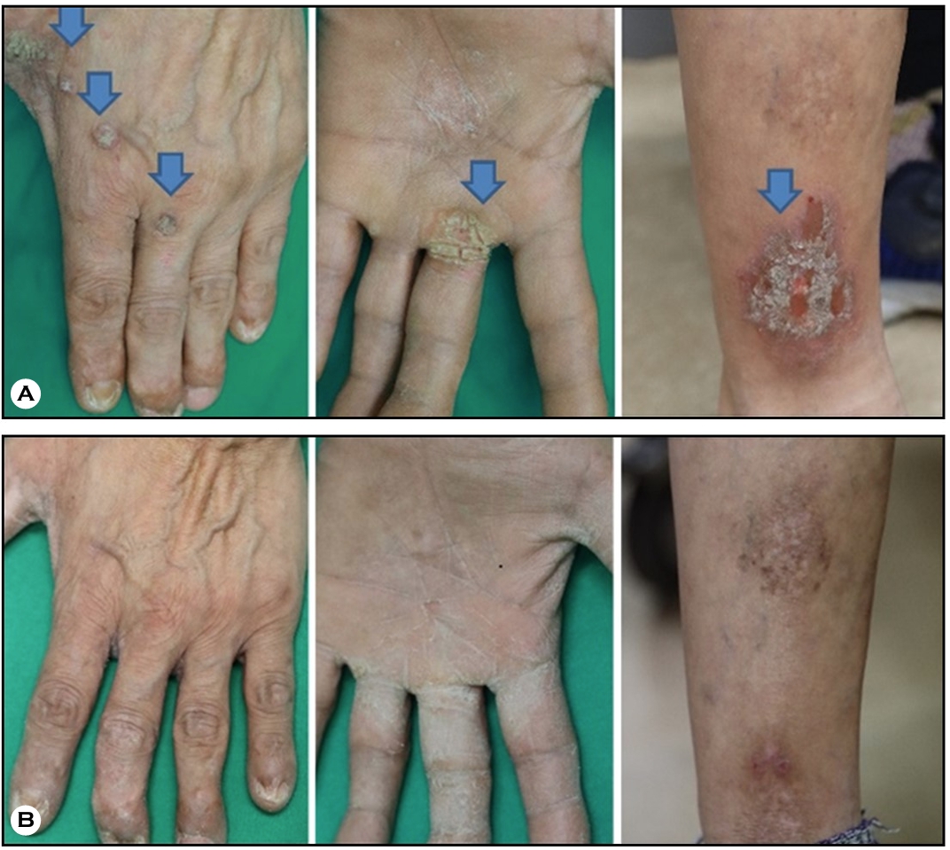 A 63-year-old man with a 6-year history of adult-onset severe AD presented with numerous verrucous papules on both his hands and legs that had persisted for 3 years. He had been receiving intermittent systemic cyclosporine (150-200 mg daily) for over a year but was then switched to dupilumab. A skin biopsy from a verrucous plaque on the dorsum of the hand and leg confirmed the diagnosis of verruca vulgaris (Fig. 1). Thereafter, a single intralesional bleomycin injection was administered, but further treatments were discontinued due to pain. However, the wart lesions remained largely un- changed for 2 years following the bleomycin injection. After dupilumab therapy was initiated, his EASI score improved from 24 to 5.9 after 6 months. During dupilumab therapy, the patient developed alopecia areata, prompting a temporary reintroduction of cyclosporine, which was subsequently dis- continued 2 years and 6 months after initiating dupilumab. By the third month after its discontinuation, the longstanding warts began to decrease in thickness and eventually resolved completely following the cessation of systemic immuno- suppressive therapy (Fig. 2).