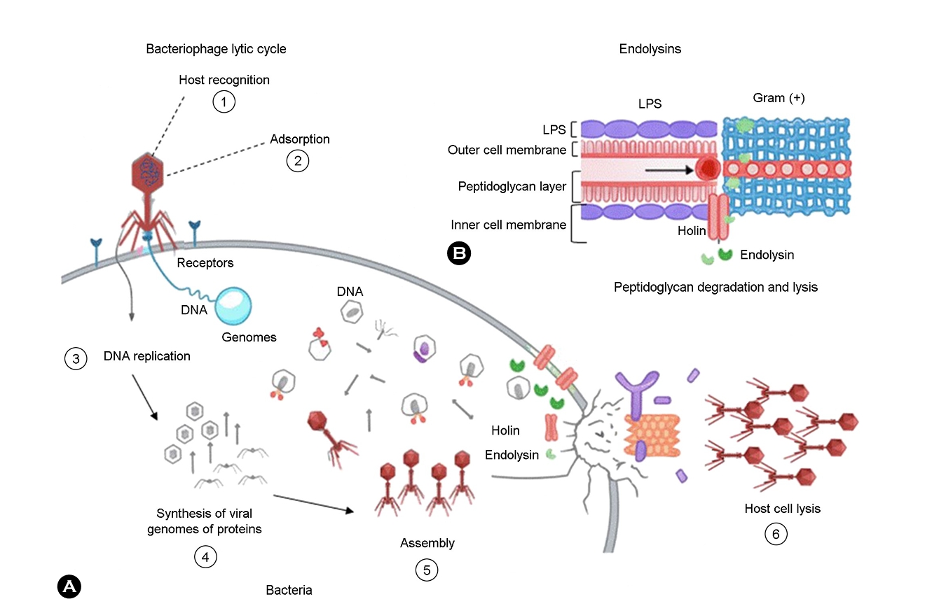 Phages exert therapeutic effects through precise bacterial targeting, efficient lytic activity, and minimal disruption of commensal microbiota. The phage life cycle begins with re- cognition and binding to specific bacterial surface receptors that determine host specificity. In skin-associated pathogens, these receptors include lipoteichoic acids on S. aureus, cell wall–associated surface structures on C. acnes, and type IV pili on P. aeruginosa, which serve as essential adsorption receptors for phage PA1Ø6. After attachment, phages inject their genetic material into the host cell, thus leading to take- over of bacterial metabolism, intracellular replication, and eventual host lysis. Newly released virions then infect neigh- boring bacteria, allowing localized amplification at the infection site18,19. Fig. 2 summarizes the lytic phage life cycle's key steps and phage-derived endolysins' bacteriolytic action against skin-associated pathogens.