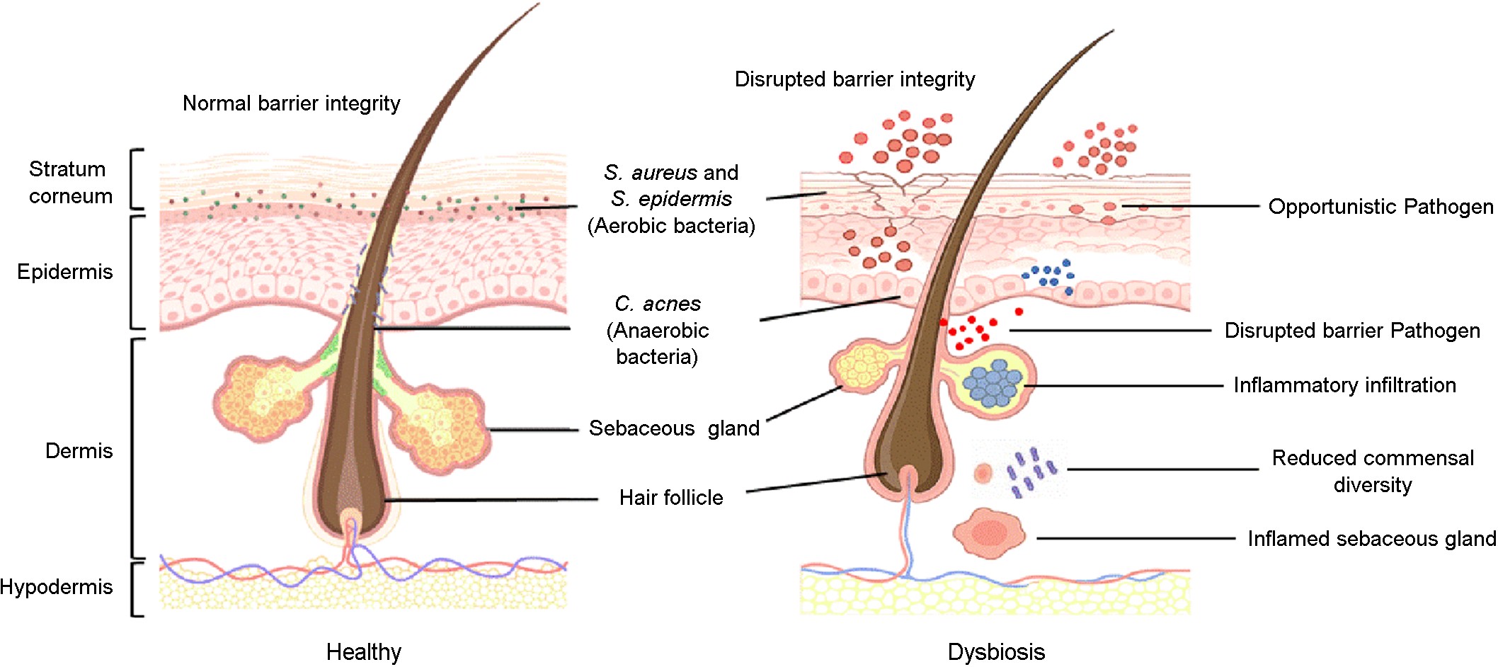 Together, these findings establish dysbiosis as a central driver of skin disease. Defining microbial and viral community shifts across acne, AD, and chronic wounds provides a critical foundation for precision therapeutics. In this context, phages and endolysins offer targeted strategies to eliminate pathogens while preserving the skin's broader microbial ecosystem17. Fig. 1 illustrates commensal microbes' spatial organization in healthy skin and characteristic shifts observed during dysbiosis across major skin diseases.
