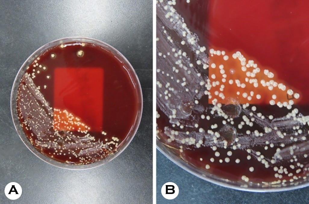 A definitive diagnosis of dermatophilosis relies on isolating the organism or identifying its characteristic morphological features in clinical specimens1,4,5. In the present case, micro- biological culture played a pivotal role. Nevertheless, our case encountered initial challenges, which have yielded significant insights for clinical laboratories. Although D. congolensis is generally known to optimally grow at a temperature of 37℃, routine skin cultures are often processed under protocols for superficial fungal infections, thereby using lower incubation temperatures2. Moreover, preliminary incubation at a tem- perature of 30℃ yielded insignificant growth, which could have been readily disregarded as negative or nonspecific. The characteristic rough, wrinkled, adherent, and golden-yellow colonies with β-hemolysis became prominent only after modifying the incubation condition to a temperature of 37℃ with 2.5% CO21,2,5,7-9. This observation emphasizes the fact that while the organism may survive at various temperatures, optimal isolation from human skin samples requires a strict adherence to higher incubation temperatures (37℃)1,2. Clini- cians and microbiologists should be aware of this requirement to avoid false-negative results, particularly when standard empirical treatments fail1.